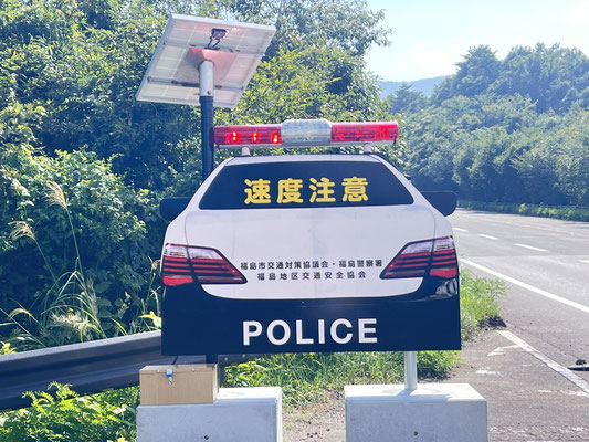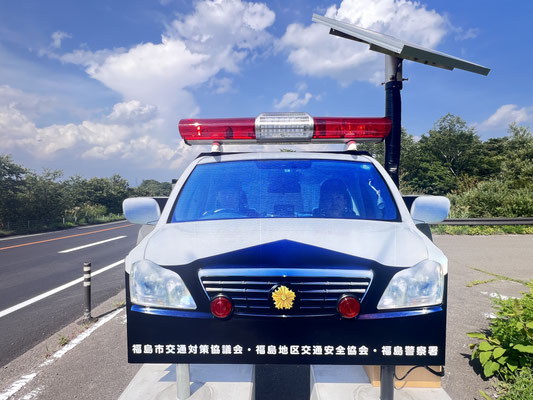 直線道路では、約800m先から見える反射効果を利用し、約50mくらいまで近づかないとまったく模擬パトカーであることが区別しにくい看板です。