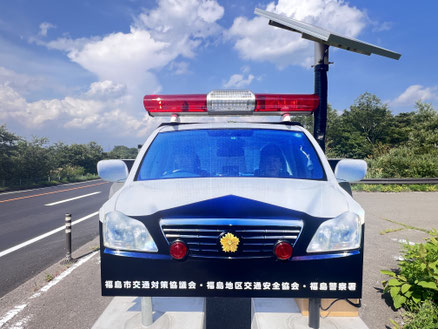 昼間は標語が目立つ看板として夜間は反射材によりパトカーに変わります。